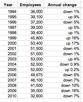 The company had 32,600 employees as of Dec. 31, down 7% from 35,000 at the end of 2009, according to the annual 10-K filing with the U.S. Securities and Exchange Commission. (See table, above.) That decline was considerably less than the 16% plunge in 2008-2009, and reflected the company's more stable financial position as the world's economy emerged from a deep recession.
