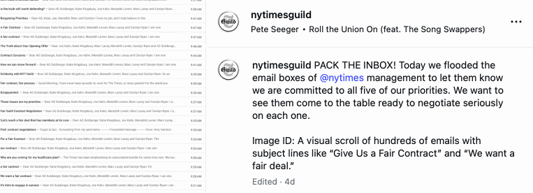 Guild members scheduled a new email to be sent at the top of each minute, beginning before 8 a.m. Eastern Time. Hundreds of emails crowded the inboxes of Times’ top brass.